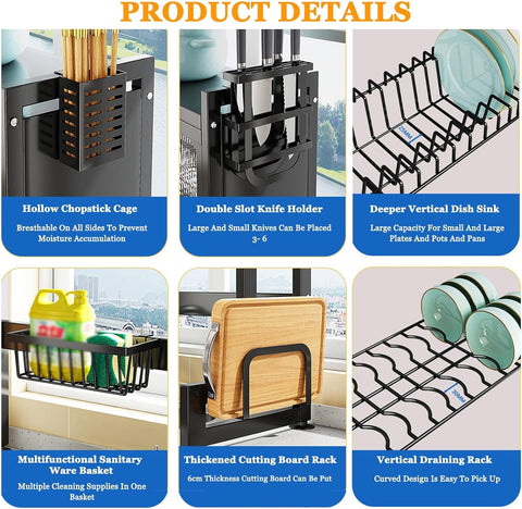 Puerta de armario abatible: el estante para cubiertos sobre el fregadero es lo suficientemente duradero. La tapa abatible no ocupa espacio y es conveniente para el almacenamiento, y la gran capacidad puede almacenar toda la vajilla. El diseño sobre el fregadero permite que el agua drene directamente en el fregadero en lugar de la mesa, evitando eficazmente la acumulación de agua.Material de acero inoxidable: hecho de acero inoxidable 304, el estante de vajilla sobre el fregadero es lo suficientemente resistente para un uso a largo plazo. Además, su gran capacidad le permite almacenar 19 platos, y el diseño sobre el fregadero le permite drenar el agua directamente al fregadero, en lugar de a la mesa, evitando eficazmente la acumulación de agua.Organizador de cocina multifuncional: el estante expandible proporciona más espacio sin ocupar más espacio en la encimera, lo que es muy conveniente. Puede satisfacer las necesidades de cualquier aparato de cocina. Este sería un gran organizador de cocina. Todos los accesorios que necesitas están completos, incluyendo cesta de limpieza, soporte para cuchillos, soporte para bloque de cortar, barril de palillos, gancho ". (Todos los accesorios están hechos de acero inoxidable)Montaje sencillo y fácil limpieza: el soporte para platos está equipado con una llave hexagonal y una llave, que no requiere herramientas adicionales y es fácil de instalar. Monte los módulos correspondientes de acuerdo con las instrucciones. Todos los accesorios se pueden quitar fácilmente para limpiarlos limpiándolos con una toalla húmeda. Ahora añádelo a su carrito de compras, y su cocina tendrá un escurridor de vajilla perfecto.