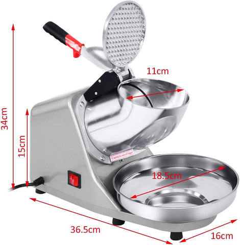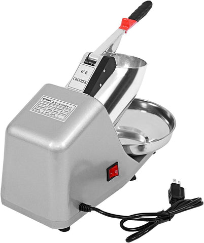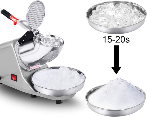 TRITURADORA DE HIELO VERSÁTIL: Con una gran disipación de calor, nuestra trituradora de hielo puede continuar funcionando durante 20 horas y es ideal para uso doméstico o comercial. Es adecuado para restaurantes, bares, cantinas, fiestas, reuniones en casa.BUEN AYUDANTE PARA AFEITAR HIELO: Nuestra afeitadora de hielo funciona bien con cubitos de hielo o hielo triturado en bolsas. Puedes poner diferentes tipos de hielo siempre que sean del mismo tamaño que la tolva. El potente motor puede producir 65 kg de hielo raspado por hora para satisfacer la demanda de grandes cantidades de hielo en un tiempo relativamente corto.GARANTÍA DE SEGURIDAD: Nuestra máquina trituradora de hielo posee una base fundida pesada con almohadillas antideslizantes, una estación de trabajo estable para garantizar que la vibración y el ruido se deduzcan al grado más bajo. Además, el interruptor de encendido/apagado resistente al agua es fácil de controlar, se cortará automáticamente cuando la tolva esté abierta, lo que garantiza su funcionamiento seguro para evitar heridas o lesiones.FÁCIL DE OPERAR: El diseño humanizado le permite usar fácilmente esta trituradora de hielo en la vida diaria. Simplemente conéctelo, agregue cubitos de hielo y presione el mango para obtener hielo raspado sin problemas.MATERIAL DURADERO DE GRADO ALIMENTARIO: Nuestra máquina afeitadora de hielo está hecha principalmente de acero inoxidable y aluminio de primera calidad, también viene con un recipiente de acero inoxidable, lo que lo hace conveniente para servir. Además, podrás limpiarlo rápidamente después de su uso. Realmente ahorre tiempo y energía.
